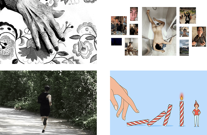 Arriba a la derecha, “Dolores, Remedios y Consuelo”, y a la izquierda, “Dutxa”. Bajo, a la derecha Una vida para vivir y a la izquierda, “Two girls one cake”.