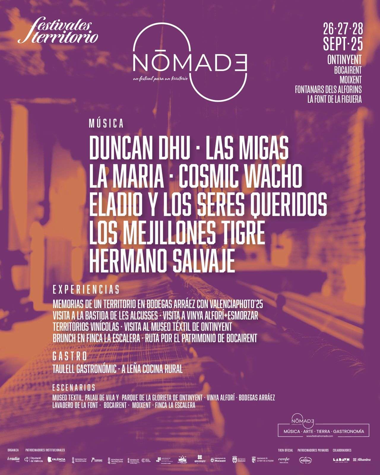 Duncan Dhu protagoniza la propuesta musical de la mano de su cantante Mikel Erentxun con la gira DD40 Tour, que conmemora el 40 aniversario de una de las bandas más influyentes del rock español. También pasarán por los escenarios de Nómade Las Migas, La Maria, la banda Cosmic Wacho, Los Mejillones Tigre o Hermano Salvaje. Una propuesta de grupos de la comunidad valenciana y nacionales que tocarán en escenarios singulares situados en espacios de alto valor patrimonial de la zona.