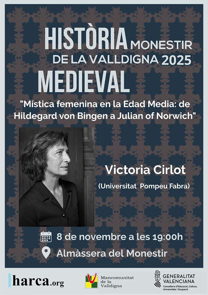 El Monasterio de Santa María de Valldigna se convertirá este sábado 8 de noviembre a las 19:00 horas en escenario de una cita cultural de primer orden: la conferencia “Mística femenina en la Edad Media: de Hildegard von Bingen a Julian of Norwich”, a cargo de Victoria Cirlot, una de las voces más respetadas e influyentes en el estudio del pensamiento simbólico, la mística medieval y la cultura visionaria de la edad media. La sesión, organizada por el Grup Harca y la Mancomunitat de la Valldigna, cerrará por este año el ciclo de conferencias de historia medieval que en solo tres ediciones, del 2023 al 2025, se ha consolidado como un referente de divulgación rigurosa y excelente a escala estatal.