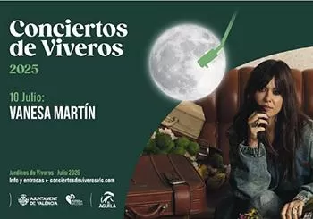 La sesión de los Conciertos de Viveros del jueves llevará al escenario de los jardines del Real, a las 22:00 horas, a Vanesa Martín, quien presentará su nuevo trabajo discográfico, una colección de canciones inéditas que está previsto que se publique este año. Y la jornada concluirá con el espectáculo “Un beso y una flor. Tributo a la voz eterna”, que organiza la Concejalía de Fallas y que se celebrará en el Pabellón Norte de los Jardines del Palau a partir de las 22:00 horas.
