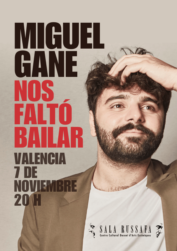 - En las actividades paralelas, el 20 de noviembre nueva visita del poeta Miguel Gane. Tras visitar diversos teatros de España, México, Ecuador y Colombia, regresa a Sala Russafa Solo nos faltó bailar, una propuesta donde la poesía y la música en vivo se alían para narrar una historia de amor.